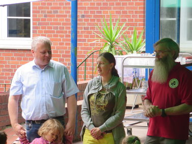 v.l: Rainer Lagemann, Bürgermeisterkandidat mit Tochter Marie, Übersetzerin, Thomas Bücking