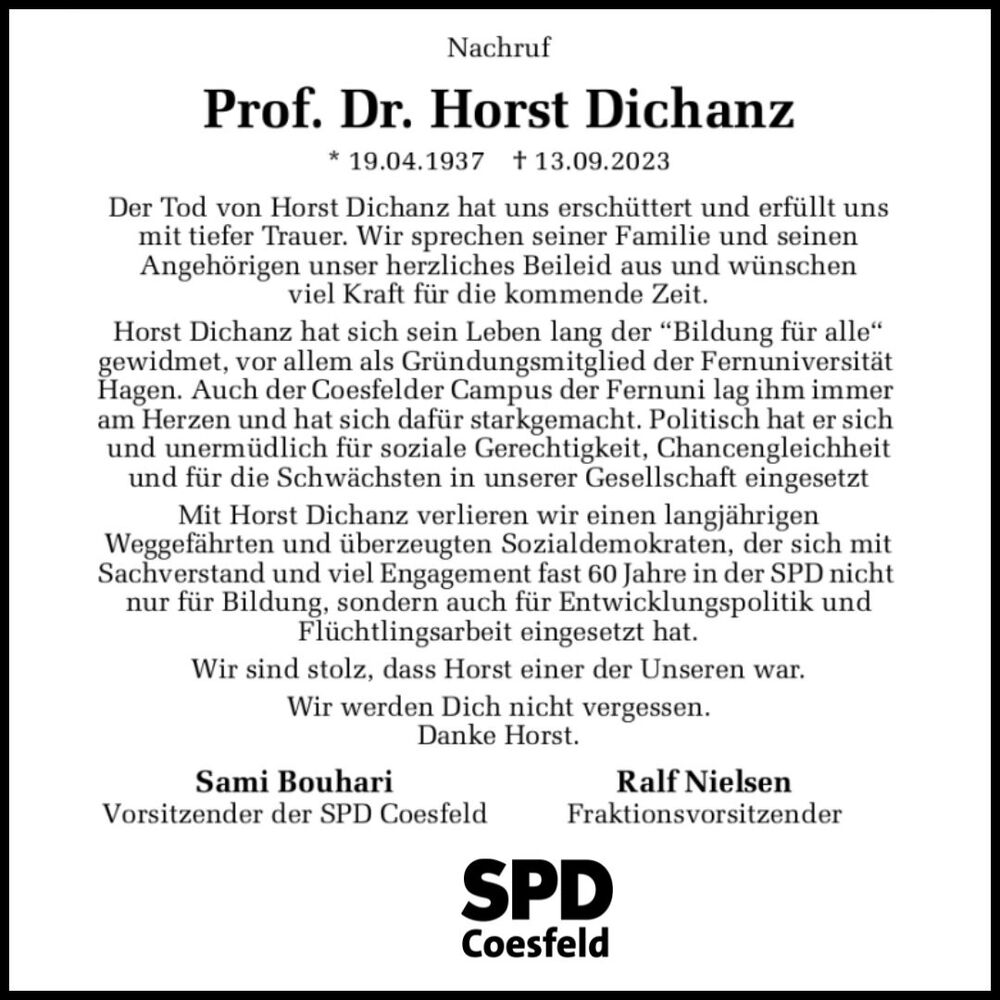 Mit Horst Dichanz verlieren wir einen langjährigen Weggefährten und überzeugten Sozialdemokraten, der sich mit Sachverstand und viel Engagement fast 60 Jahre in der SPD nicht nur für Bildung, sondern auch für Entwicklungspolitik und Flüchtlingsarbeit eingesetzt hat.