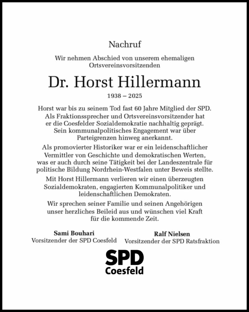Mit Horst Hillermann verlieren wir einen überzeugten Sozialdemokraten, engagierten Kommunalpolitiker und leidenschaftlichen Demokraten.