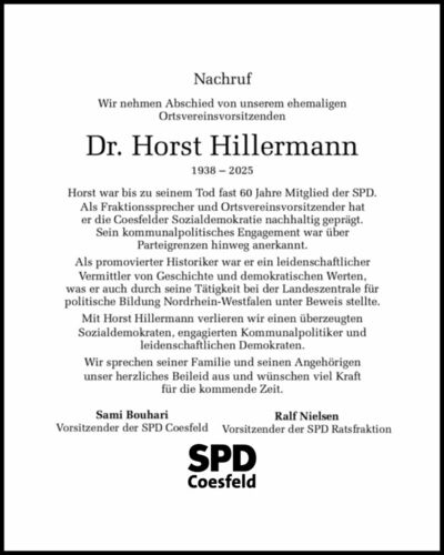 Horst war bis zu seinem Tod fast 60 Jahre Mitglied der SPD. Als Fraktionssprecher und Ortsvereinsvorsitzender hat er die Coesfelder Sozialdemokratie nachhaltig geprägt. Sein kommunalpolitisches Engagement war über Parteigrenzen hinweg anerkannt.